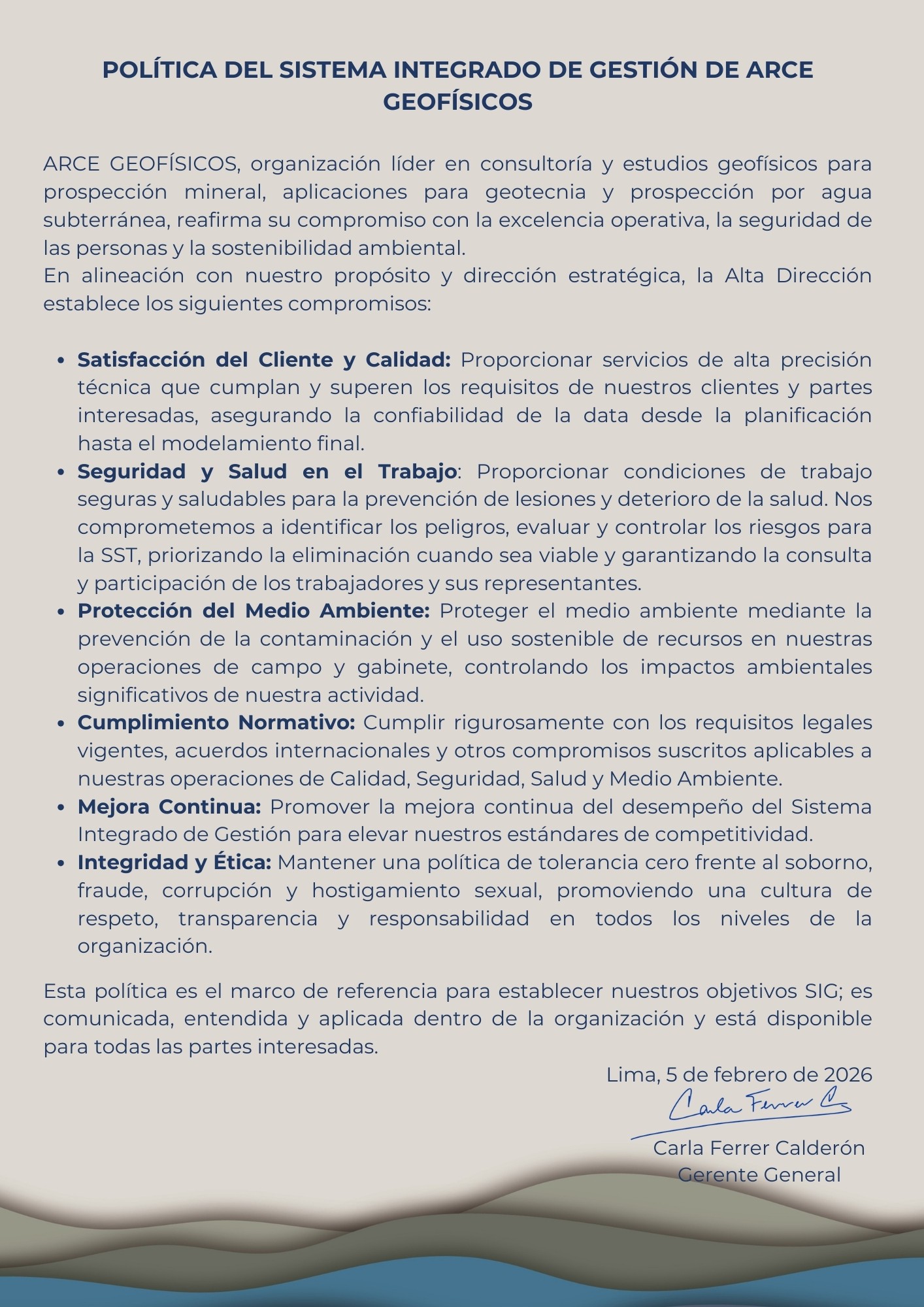 Nuestro Plan de Calidad, Seguridad, Salud, Cuidado Ambiental, se ha elaborado de acuerdo a los estándares actuales de operación. En cumplimiento de lo establecido en el marco legal vigente, los planes de trabajo desarrollados para los proyectos de estudios geofisísicos, contienen las directrices para promover el cumplimiento de los principios de la calidad, seguridad, ambiente y mejora continua contenidos en la Política del Sistema Integrado de Gestión de Arce Geofísicos y los asumidos para la ejecución de las diferente actividades que comprenden los proyectos de estudios geofísicos.
